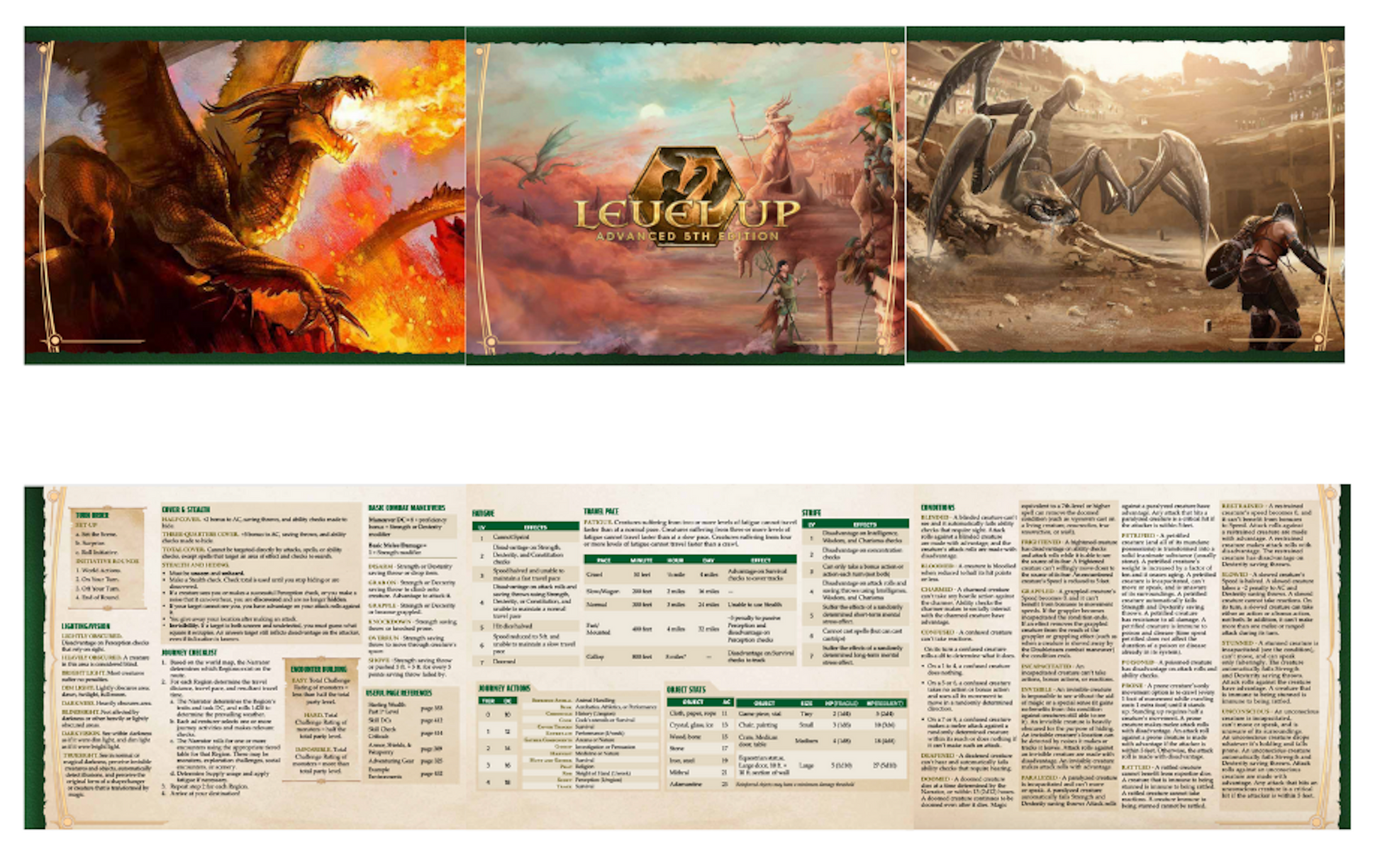 This Narrator's screen for Level Up: Advanced 5th Edition contains useful table and references for use during play.