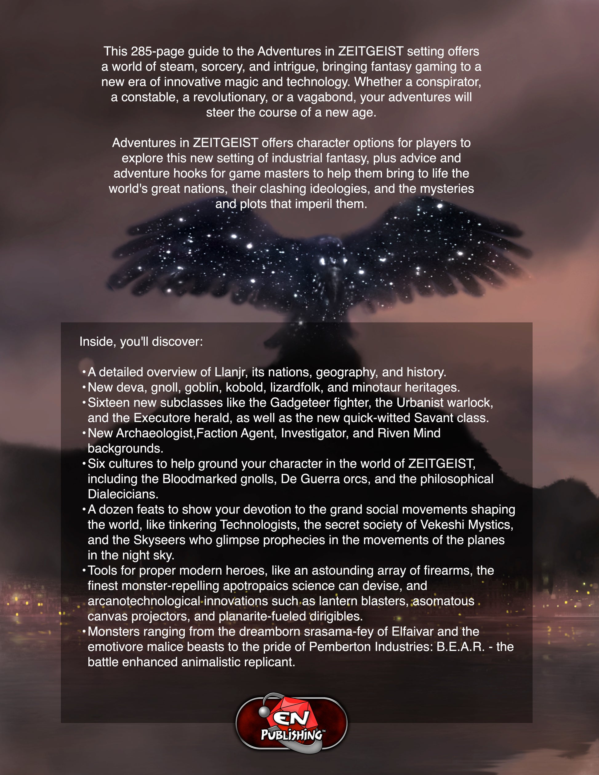 Adventures in ZEITGEIST offers character options for players to explore this new setting of industrial fantasy, plus advice and adventure hooks for game masters to help them bring to life the world's great nations, their clashing ideologies, and the mysteries and plots that imperil them.