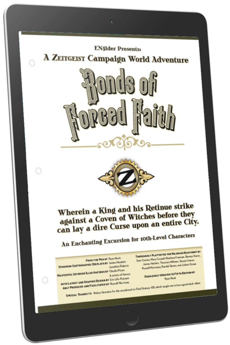 This 32-page adventure, Bonds of Forced Faith, is a prologue to the Gears of Revolution adventure path. Featuring a group of pregenerated PCs 100 years before the main adventure path begins, the players play King Lorcan Finn and his retinue which includes Dame Melissa Gahlot the Green Knight; Mayor Roland Stanfield, the reincarnated deva; Principal Minster Harkover Lee, the fire-wielding defender of the King; Godgand Thomas Masaryk, a foreign holy warrior; and Amielle Latimer, a tiefling gunsmith from Danor. This group of legendary characters must defeat a cover of witches, led by the Red Contessa, who lair on Cauldron Hill. An enchanting excursion for 10th level characters, this adventure can serve as a one-shot or as a prologue to the ZEITGEIST adventure path.